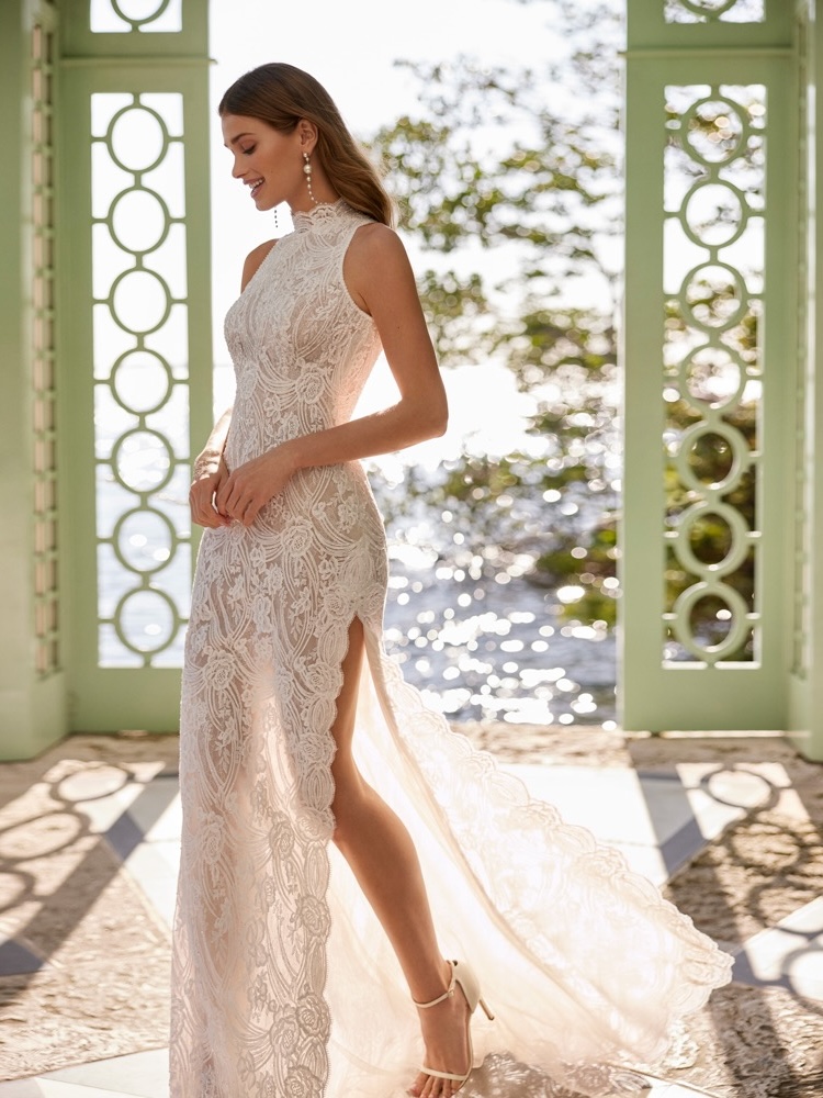 High neck mermaid wedding dress in Chantilly lace covered in cascades of delicate beaded lace detailing throughout the entire gown with a daring keyhole back and thigh high slit.