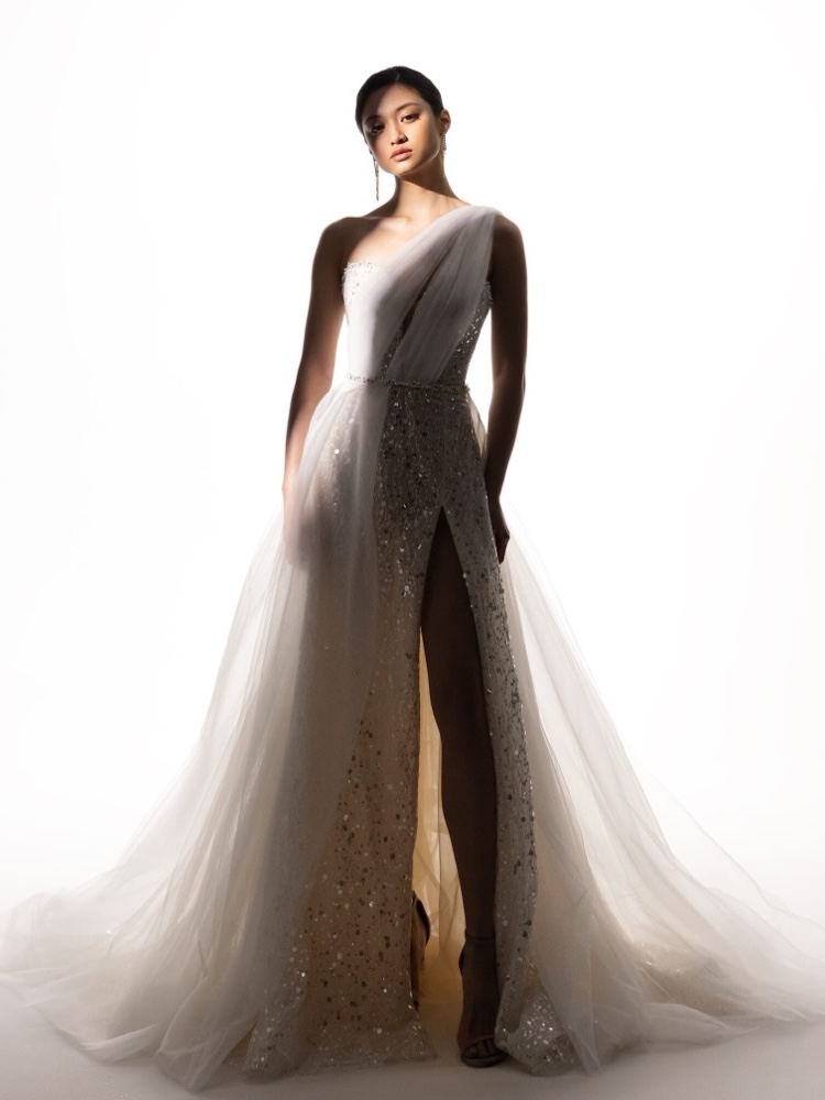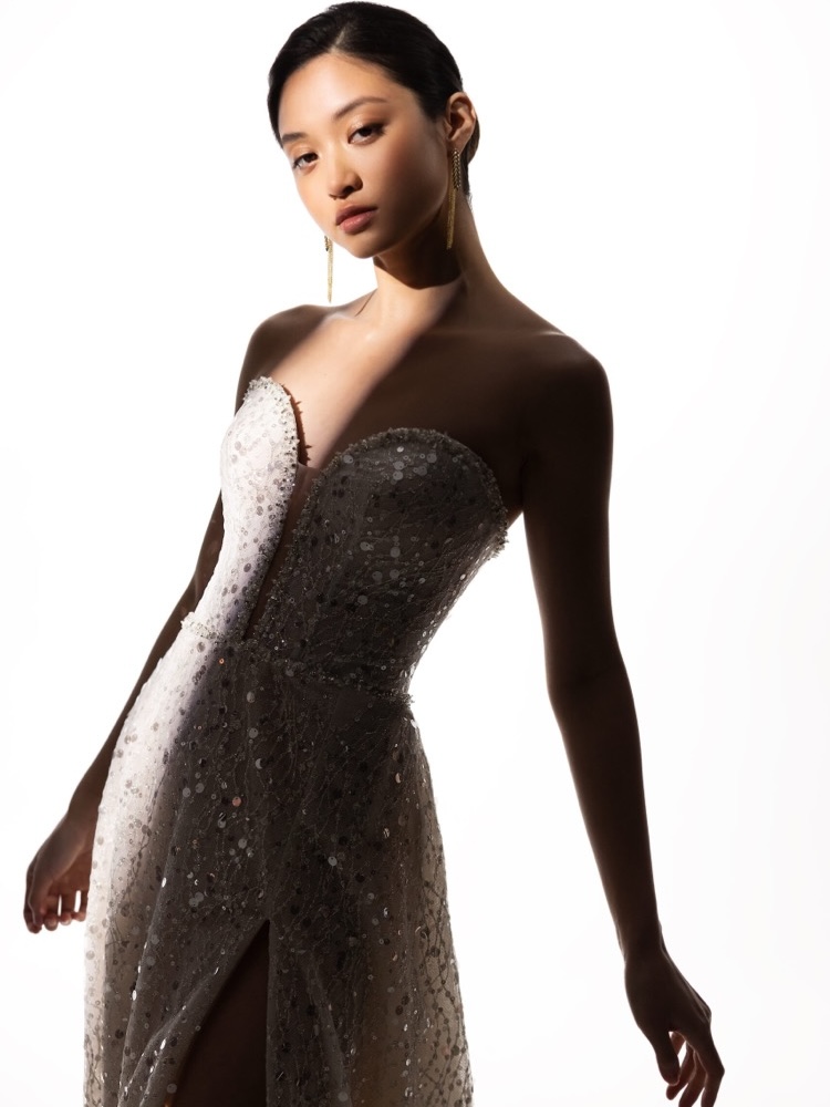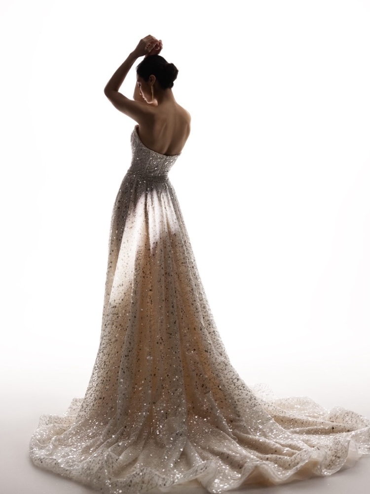 Strapless neckline A-line wedding dress crafted in glitter tulle bathed in shimmery beading and sequins allover with a daring thigh-high slit.
