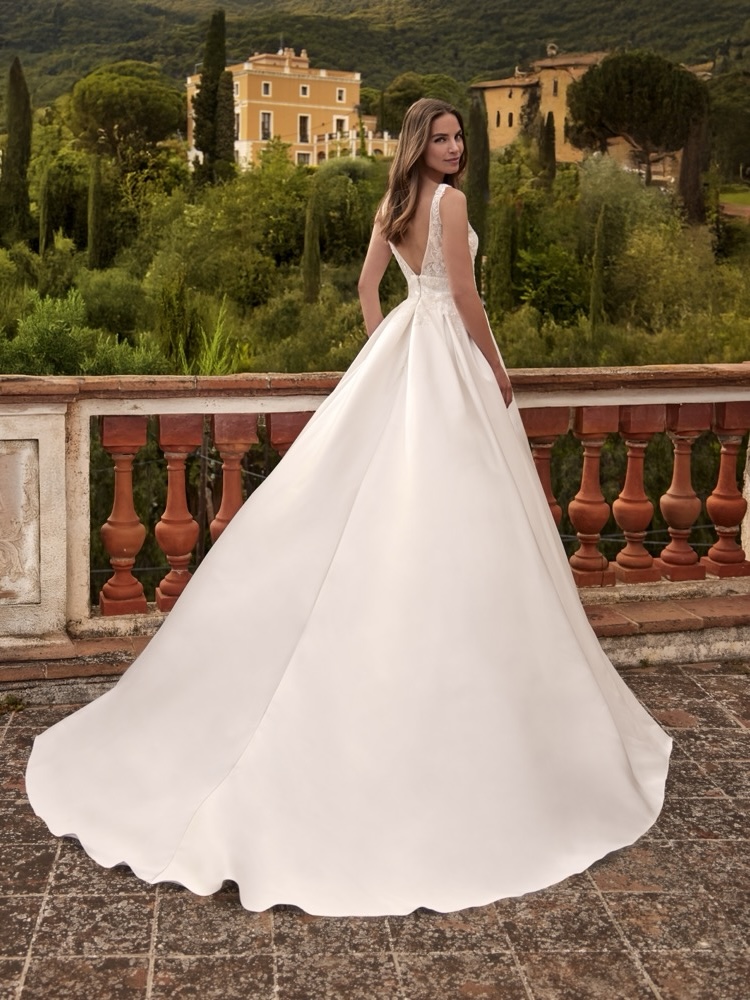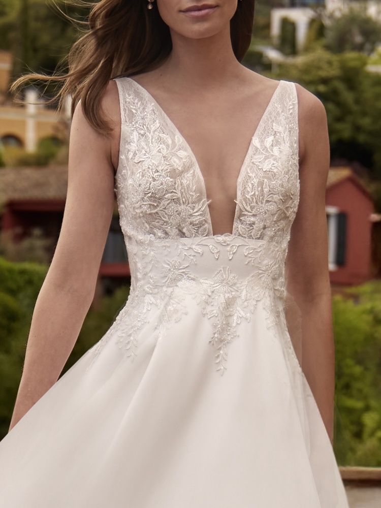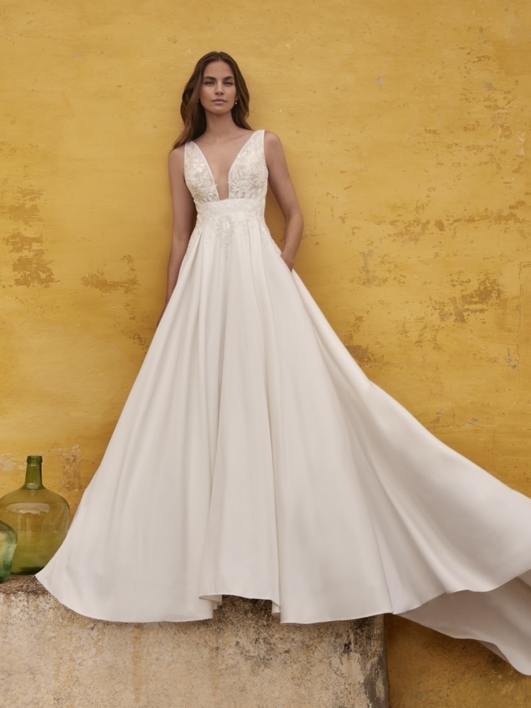 Plunging V-neck princess wedding dress made of mikado, adorned with exquisite floral lace motifs on the bodice and featuring a high-waisted skirt with a dramatic long train.