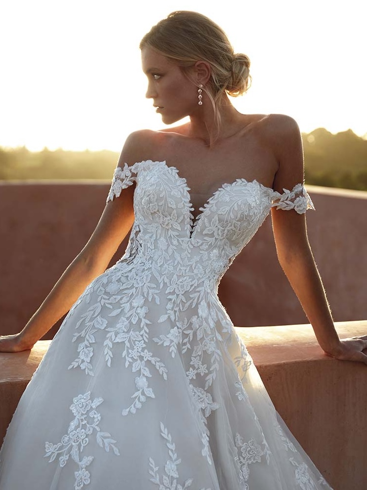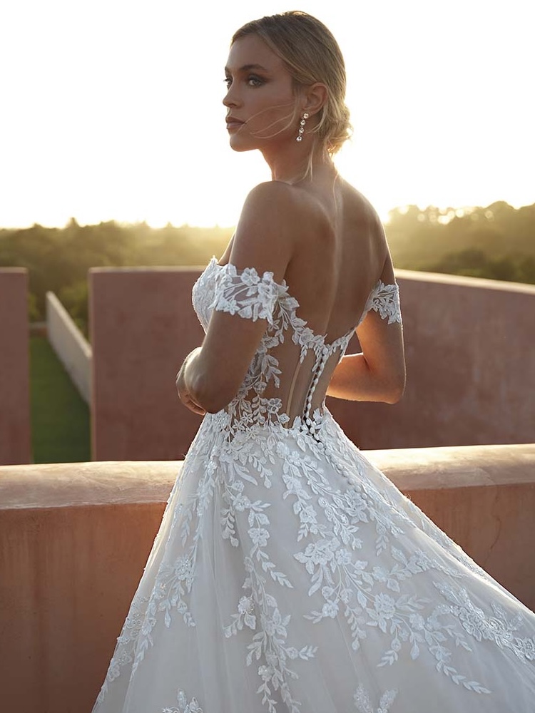Off-shoulder A-line wedding dress bathed in romantic floral lace appliques throughout the entire gown with a daring illusion back and a long train.