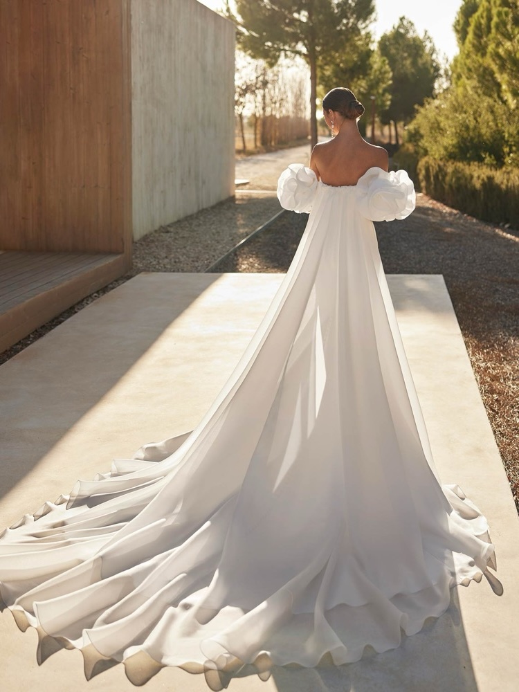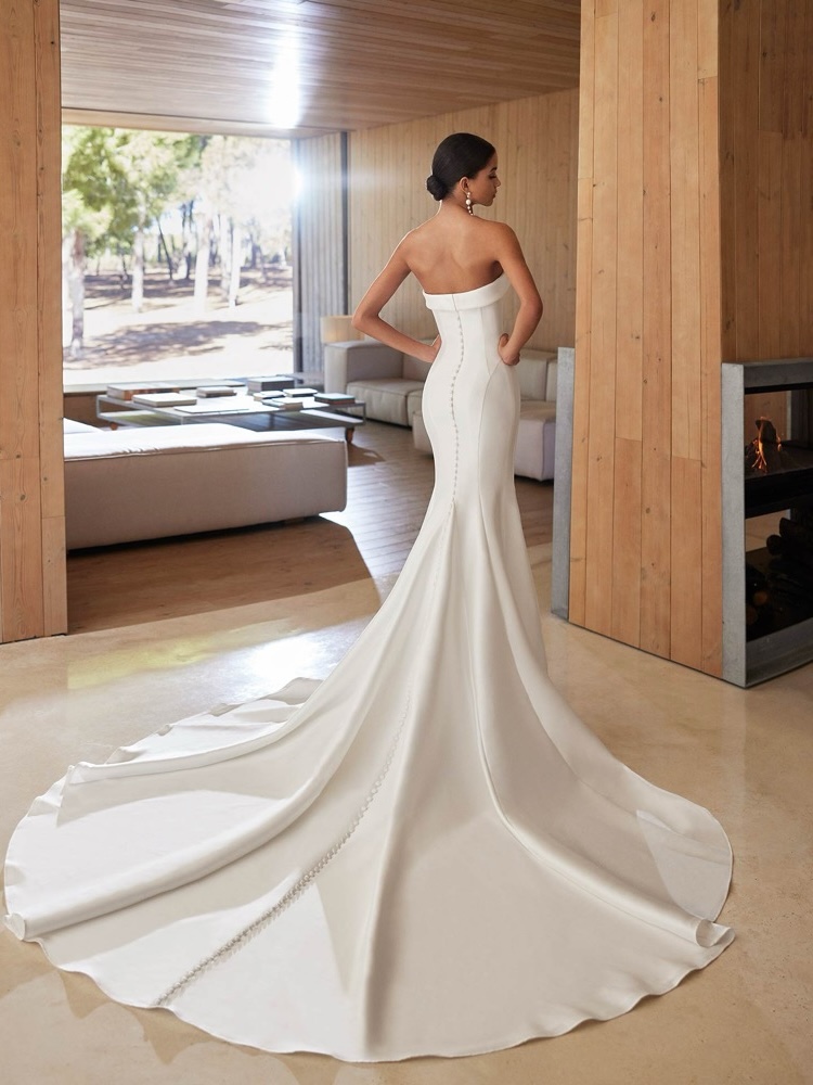 Strapless neckline mermaid wedding dress made of mikado with a folded neckline decorated with a line of buttons on the back, featuring a dramatic long train. Can be complimented with a detachable bridal coat with ruffle sleeves to personalise your bridal look.