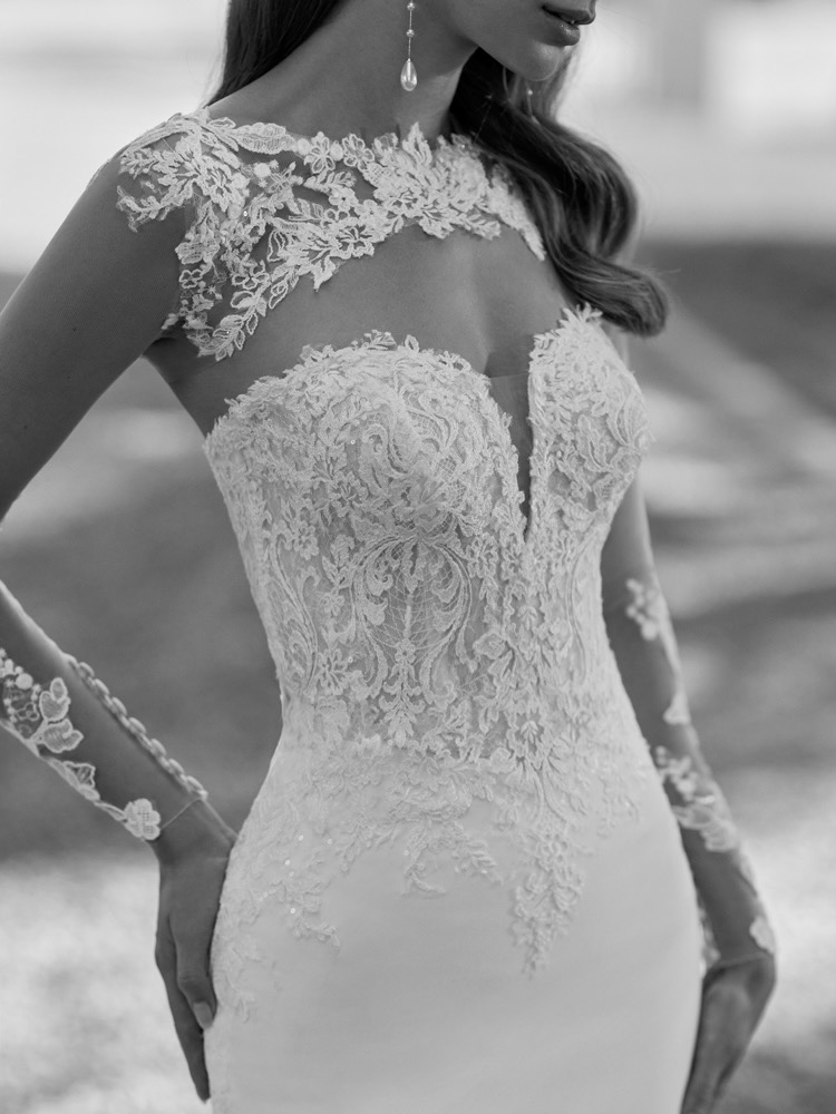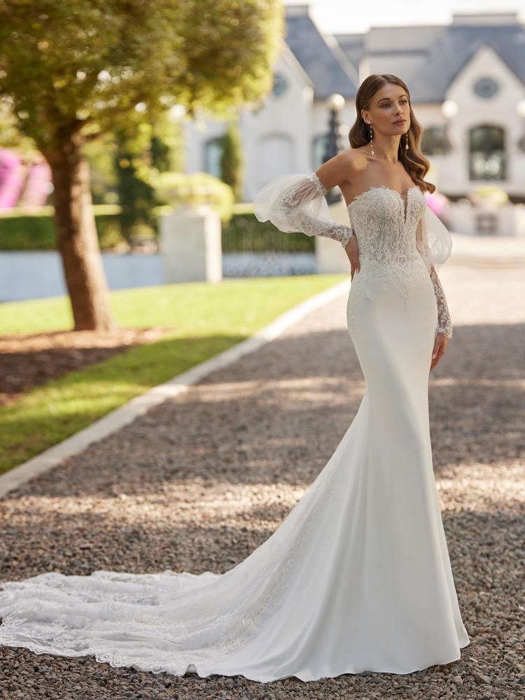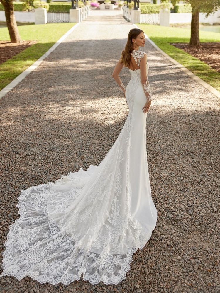Sweetheart neckline mermaid wedding dress in stretch crepe with a beautiful beaded floral lace bodice features cascading floral lace placements on the back down the extra long train. Pair it with a removable tattoo-effect long sleeve jacket to personalise your bridal look.
