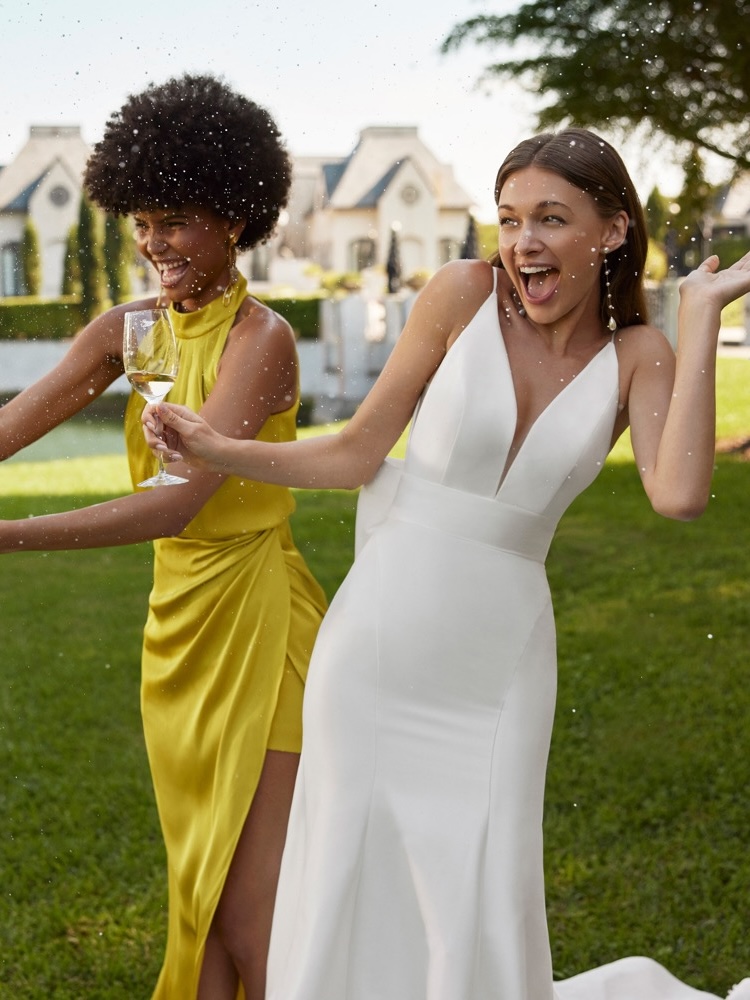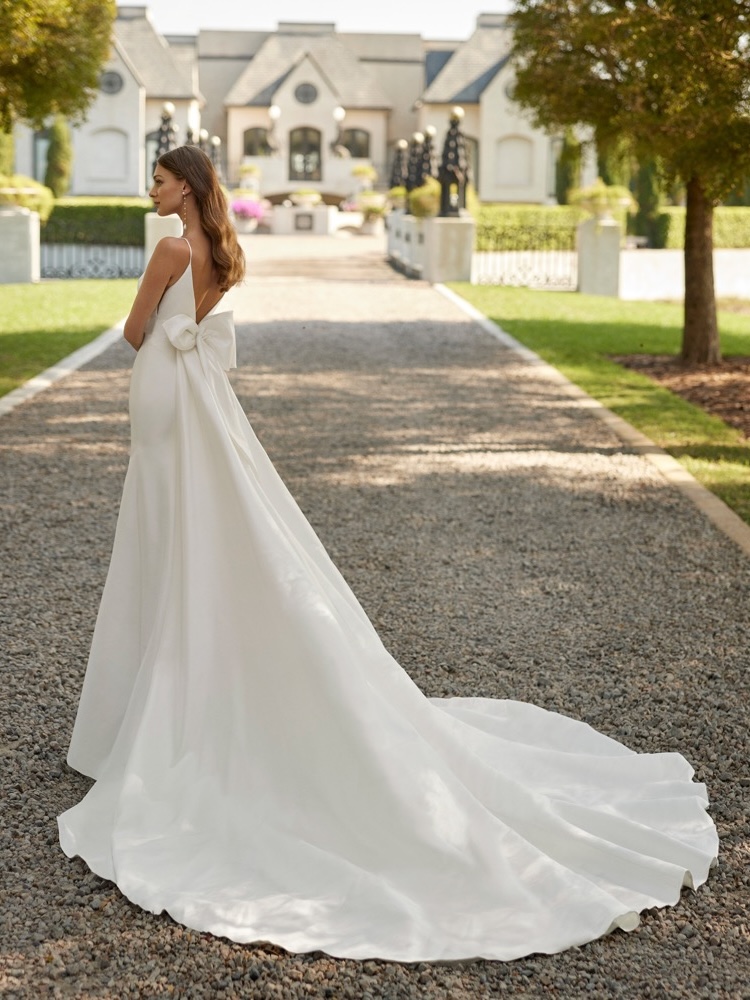 Plunging V-neck mermaid wedding dress in stretch mikado with a tailored bodice and low back featuring a detachable train with asymmetric bow.