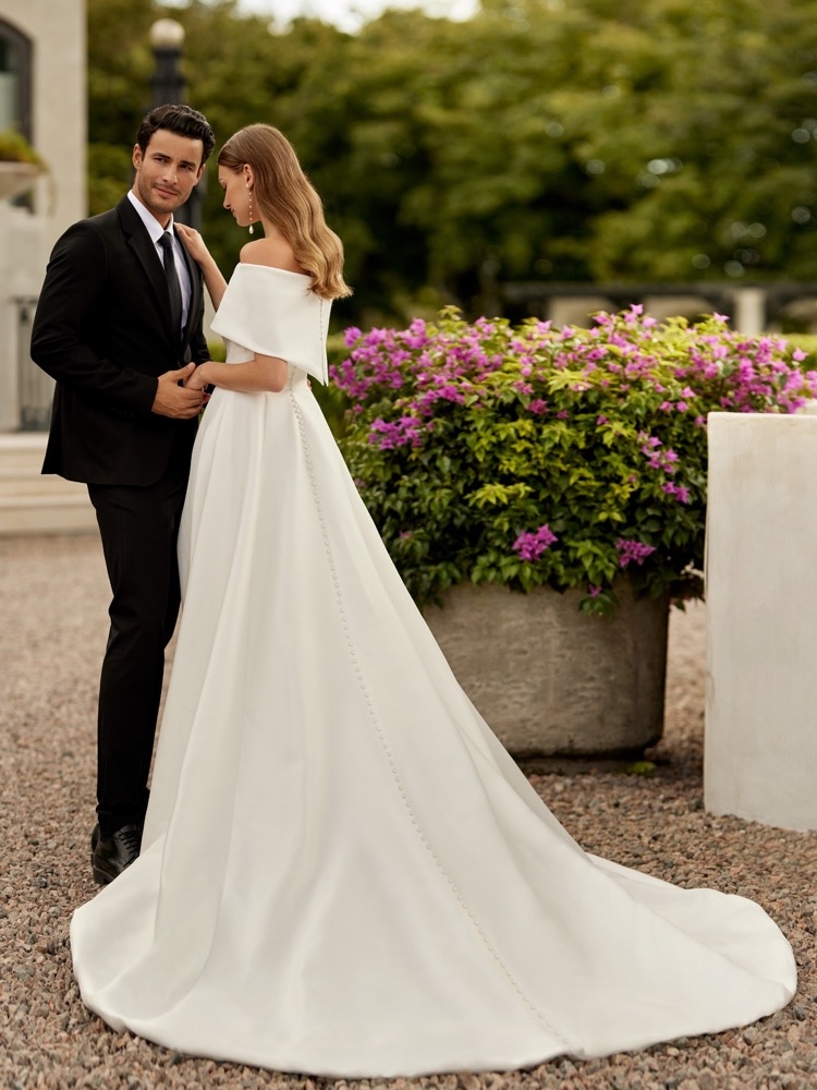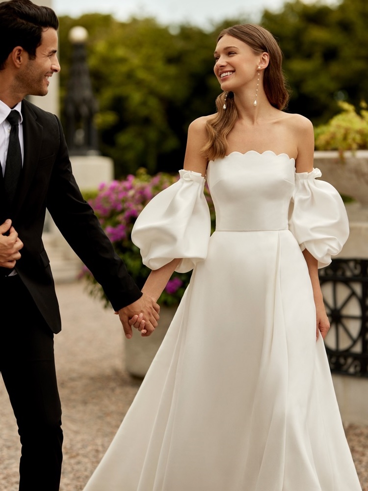 Strapless neckline A-line wedding dress in mikado with scalloped edge at the neckline with a hidden slit. Pair it with a detachable off-shoulder bridal jacket to personalise your bridal look.