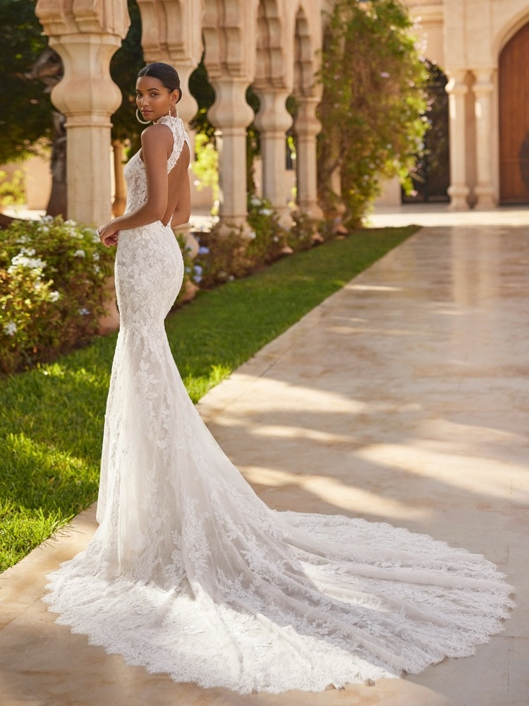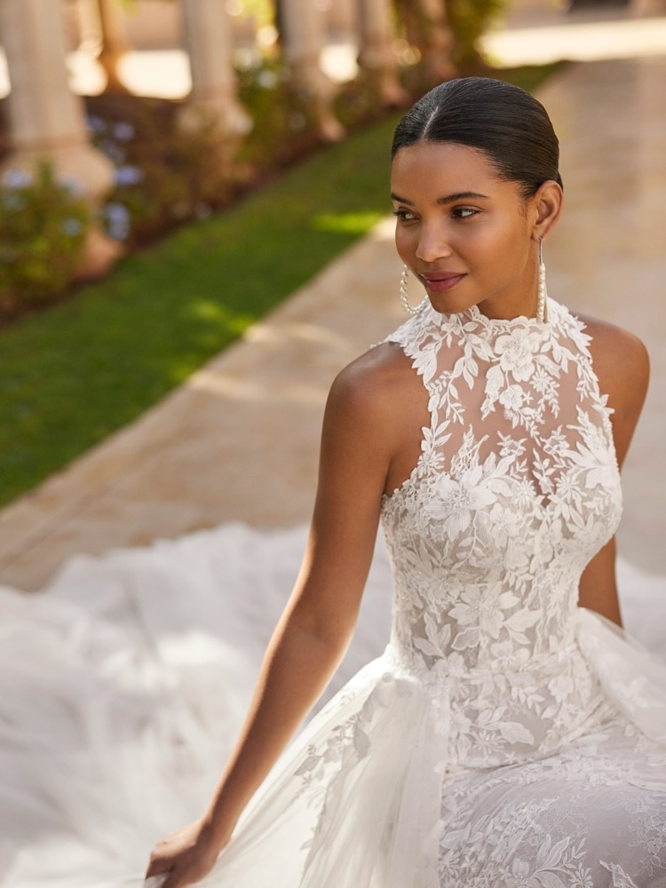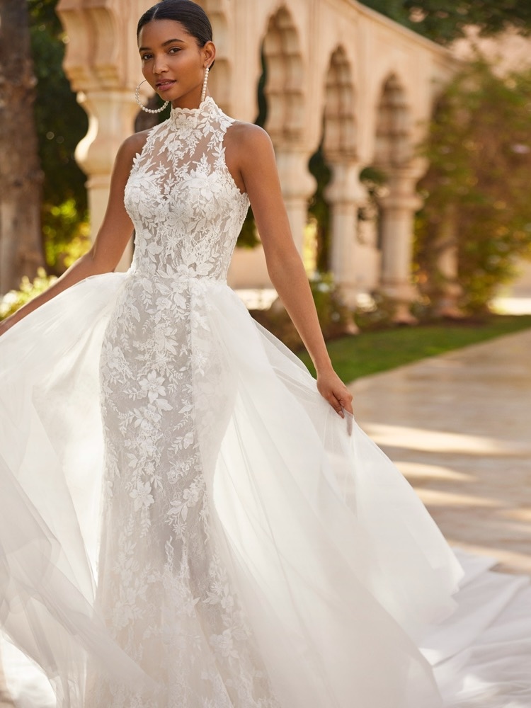 High neck mermaid wedding dress adorned with intricate floral lace and beading throughout the entire gown with a daring keyhole back. Elevate your bridal look with a flowing overskirt to personalise your bridal look.