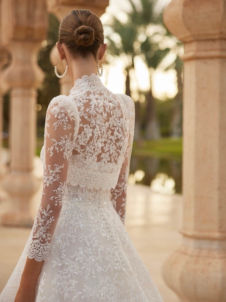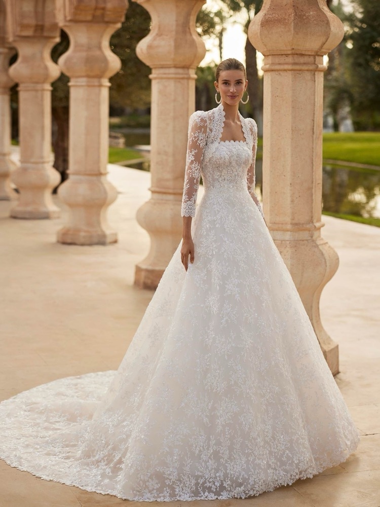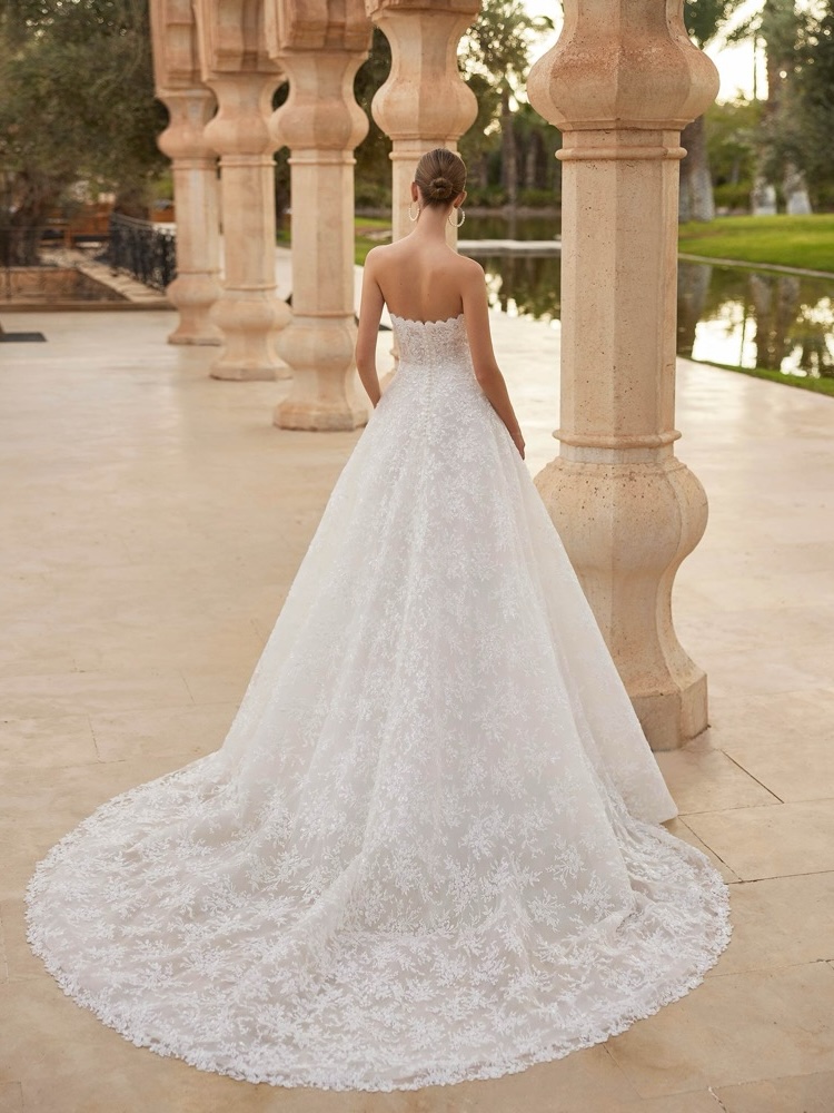 Strapless A-line wedding dress adorned with intricate lace and beading throughout the entire gown with scalloped-edge detail at the neckline. Wear it with a removable jacket to personalise your bridal look.