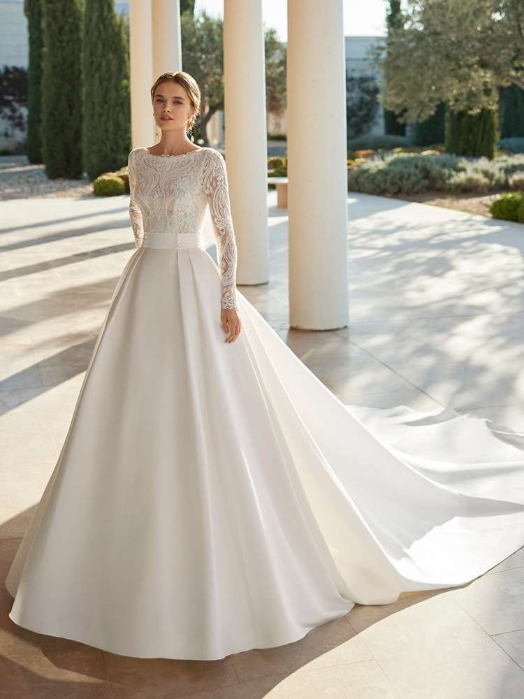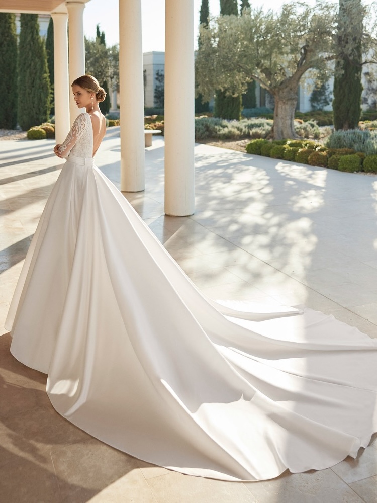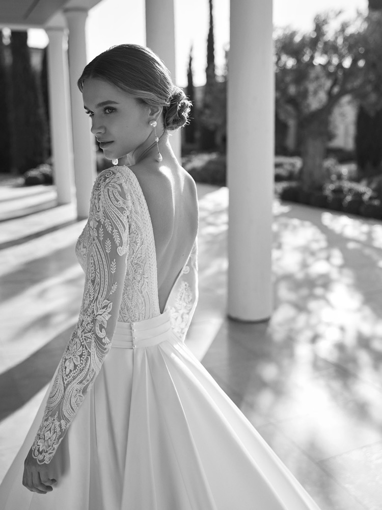 Boat neck princess wedding dress with a fitted bodice bathed in exquisite floral lace embroidery detail, leading over to a bold open V-back with tattoo-effect long sleeves. Voluminous skirt in satin with a detachable long train glides down from the waist.