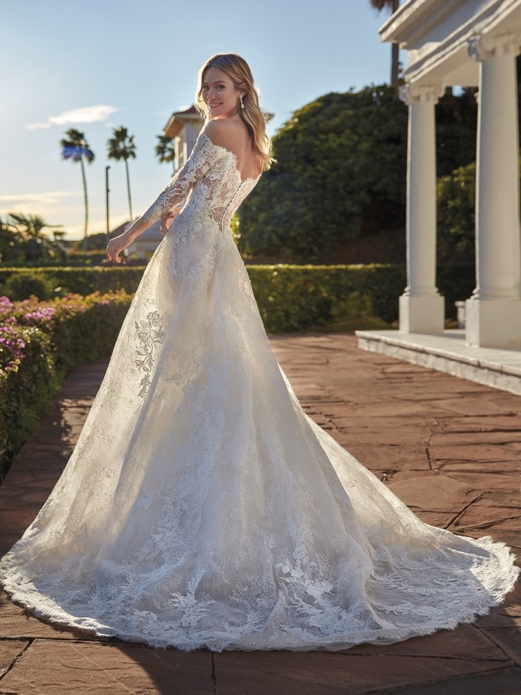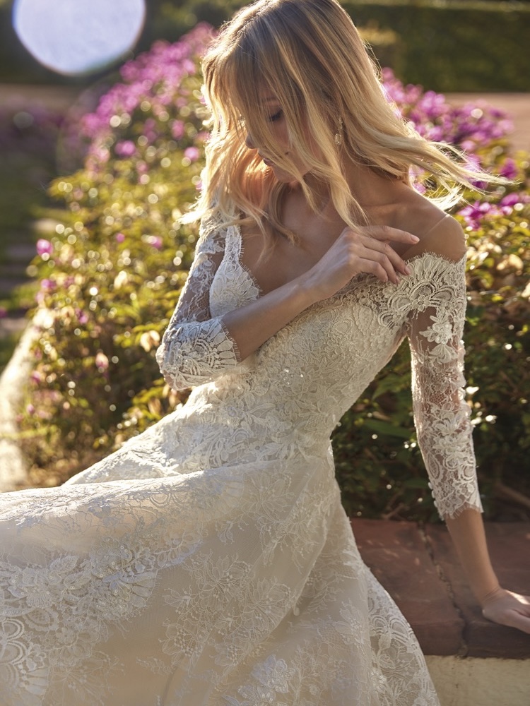 Off-shoulder A-line wedding dress in lace bathed in delicate beaded floral appliques detailing throughout the entire gown with illusion 3/4 sleeves.